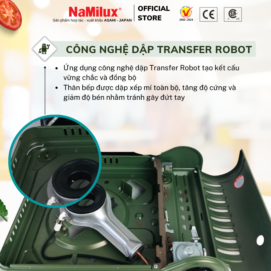 - Thân bếp: được sản xuất trên công nghệ dập TRANSFER ROBOT, các cạnh bếp đều được xếp mí toàn bộ nhằm gia tăng độ cứng chịu lực giúp an toàn khi sử dụng.