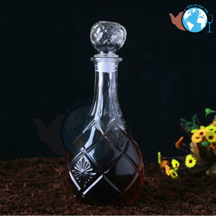 * Độ dày bình thủy tinh khoảng 5 li, kiểu dáng rất sang trọng, như bình rượu bầu, đầu nắp thủy tinh hình tròn bầu họa tiết kim cương lập thể, thân bình bầu tròn có hoa văn và khắc họa tiết sọc caro có hoa văn, thiết kế kiểu dáng cao cấp tạo hình cao quý sang trọng, thủy tinh trong suốt, nổi bật được bình đựng rượu ngâm bên trong.