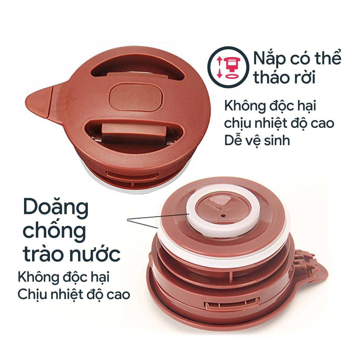 - Nắp chống trào hiện đại, kể cả khi dốc ngược. Ấn nút để có thể rót nước.
