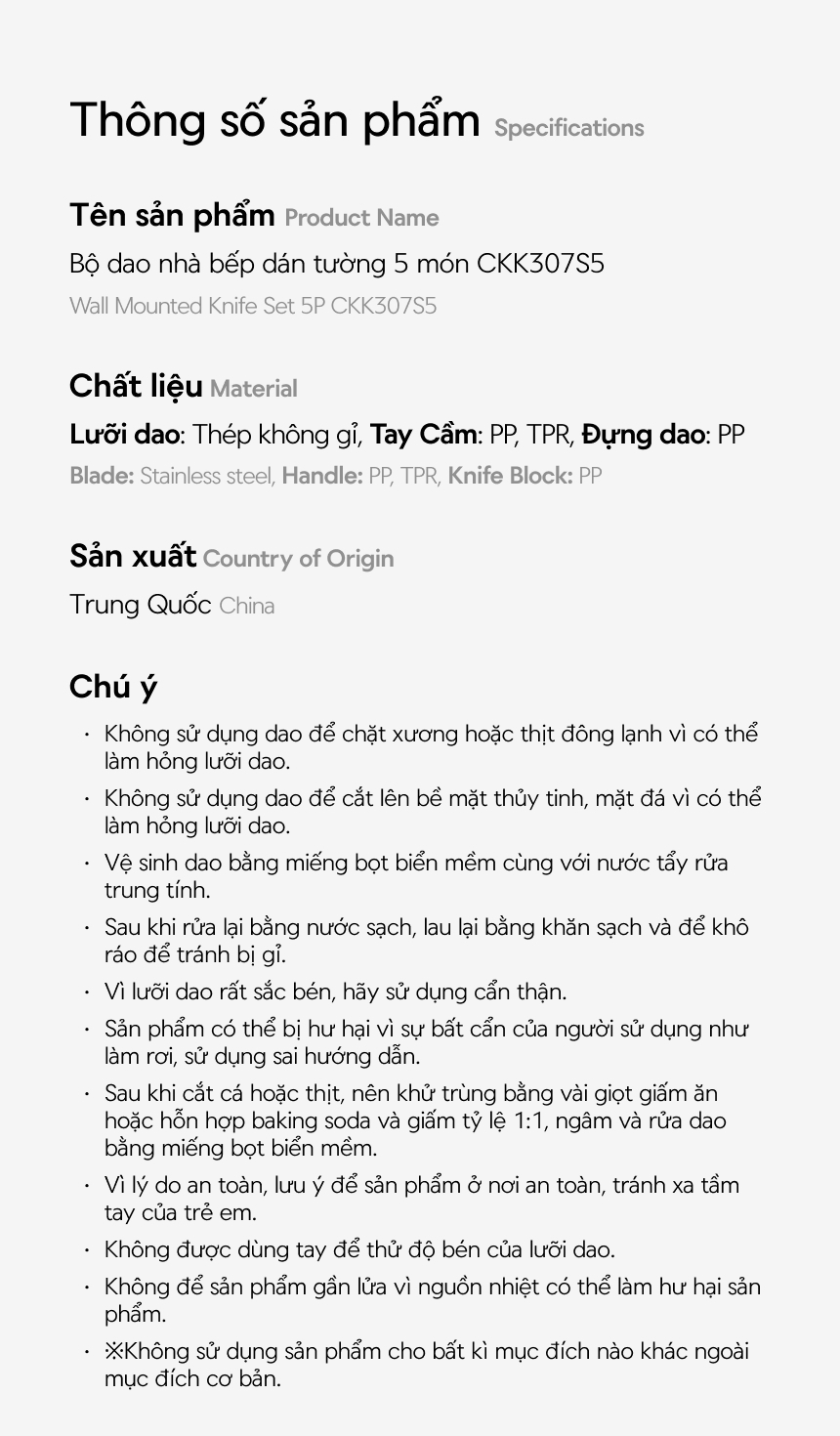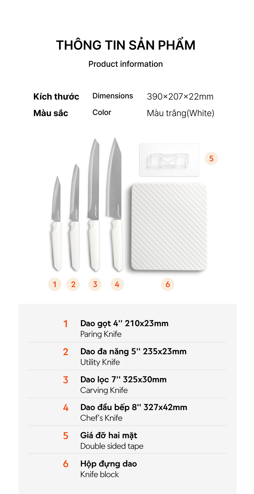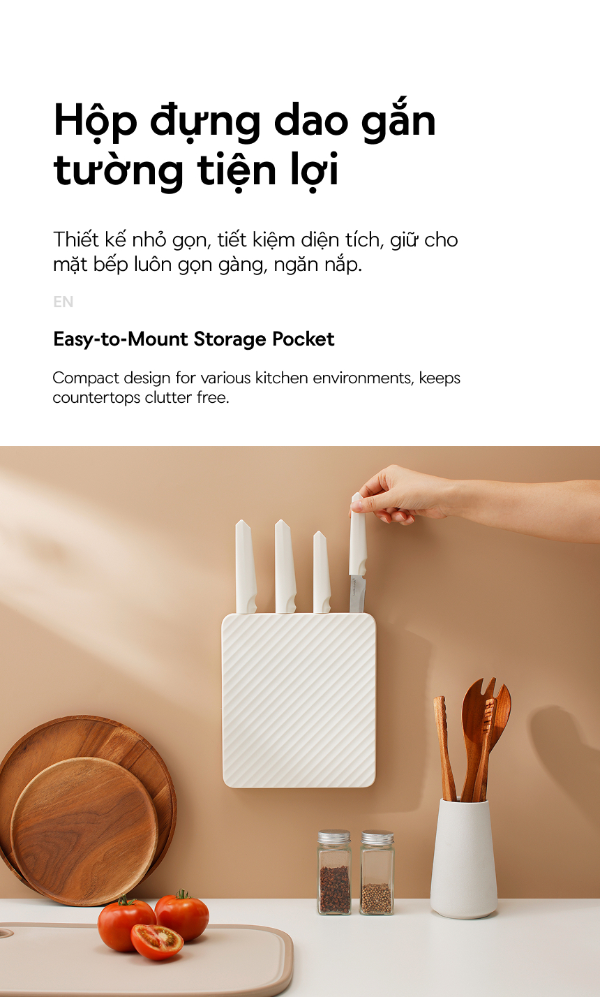 - Bộ sản phẩm bao gồm: 1 Dao đầu bếp, Dao lọc, Dao đa năng, Dao gọt, Hộp đựng dao dán tường
