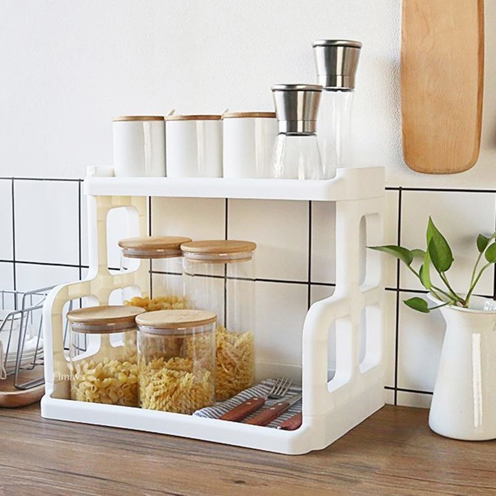 Có nhiều giải pháp để giúp chúng gọn gàng sử dụng kệ để mặt bàn, kệ treo tường hay tủ. Ngoài ra còn có một phương án khác tiện lợi hơn cả đó là sử dụng kệ đựng gia vị 2 tầng