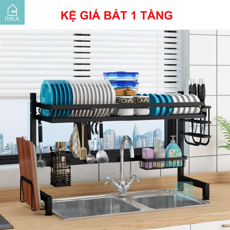 7. Bộ sản phẩm đày đủ: Kệ để chén đĩa inox, giá để dao đũa thìa, giá để thớt, giá để nước rửa bát khăn lau bát, 6 móc treo nồi.