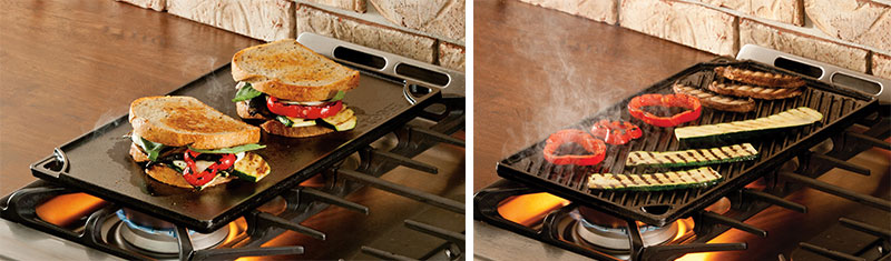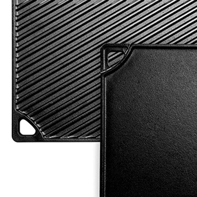 Sở hữu khay gang nướng đa năng để nướng đồ ăn ngon hơn, mặt phẳng dùng chế biến các món như bánh mì hoặc pancake, mặt vân nướng thích hợp để nướng thịt, gà, cá, hamburger hoặc áp chảo v.v.