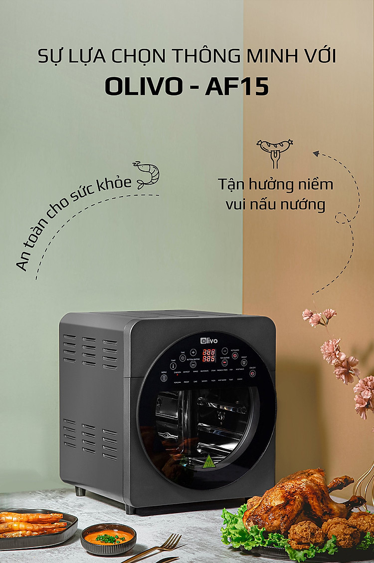 - OLIVO AF15 có thể được sử dụng thay thế các thiết bị nhà bếp khác như lò nướng, lò vi sóng, bếp nướng, máy sấy hoa quả, máy nướng bánh mì, máy làm bỏng ngô và máy làm sữa chua, nồi chiên sâu, máy làm bít tết.