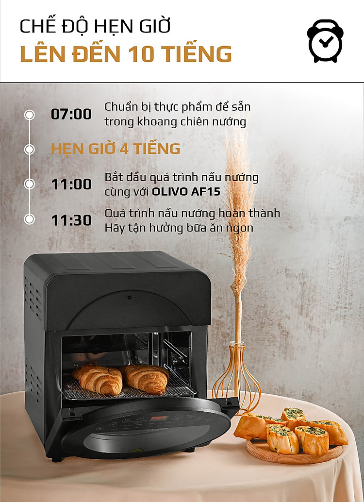 - Có trên OLIVO AF15 là một tính năng đặc biệt dành cho các bà nội trợ bận rộn và hiện đại. Nấu ăn mọi lúc, bất kì khi nào bạn cần với chức năng hẹn giờ độc đáo CHỈ CÓ trên OLIVO AF15.